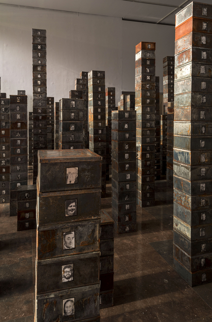 Christian BOLTANSKI, Réserve des Suisses morts, 1991, 900 boîtes métalliques avec photos noir et blanc, dimensions variables