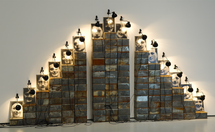 Christian BOLTANSKI, Hotel Chases, 1988, ensemble de 112 boîtes de biscuits, 15 lampes et 15 photographies en noir et blanc, 230x400 cm